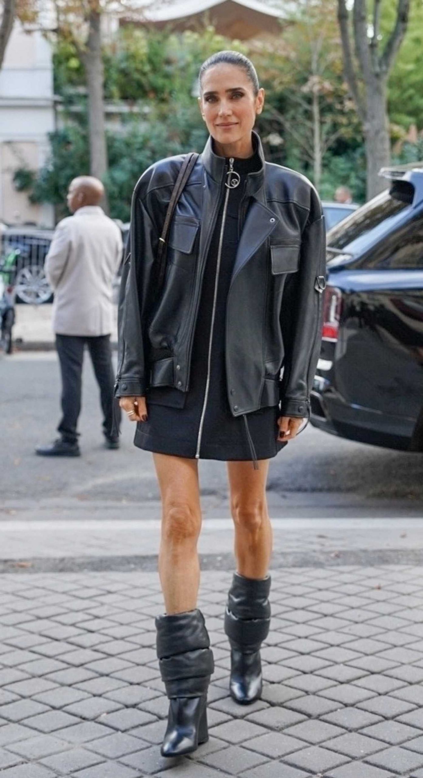 in a Black Leather Jacket Arrives at the Vogue Dinner During 2025 Paris Fashion Week in Paris 09/29/2025